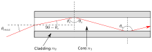where n is the refractive index of the medium, ncore is the refractive index of the fiber core, and nclad is the refractive index of the cladding. While the core will accept light at higher angles, those rays will not totally reflect off the core–cladding interface, and so will not be transmitted to the other end of the fiber.