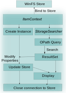 The WinFS API provides a class called the ItemContext class, which is bound to a WinFS store. The ItemContext object can be used to scope the search to the entire store or a subset of it. It also provides transactional access to the store.[15] An object of this class can then spawn an ItemSearcher object which then takes the type (an object representing the type) of the item to be retrieved or the relationship and the OPath query string representing the criteria for the search.[28][31] A set of all matches is returned, which can then be bound to a UI widget for displaying en masse or enumerating individually.[27] The properties items can also be modified and then stored back to the data store to update the data. The ItemContext object is closed (which marks the end of association of the object with the store) when the queries are made or changes merged into the store.