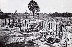 The main lines of battle now formed an "L" shape, with Hardee's attack forming the lower part of the "L," and Cheatham's attack on the Union front as the vertical member of the "L". Hood intended to attack the Union troops from both east and west. The fighting centered on a hill east of the city known as Bald Hill. The Federals had arrived two days earlier, and began to shell the city proper, killing several civilians.[13] A savage struggle, sometimes hand-to-hand, developed around the hill, lasting until just after dark. The Federals held the hill while the Confederates retired to a point just south of there. Meanwhile, two miles to the north, Cheatham's troops had broken through the Union lines at the Georgia railroad. In response, twenty artillery pieces were positioned near Sherman's headquarters at Copen Hill, and shelled the Confederates, while Logan's XV Corps regrouped and repulsed the Southern troops.[1]