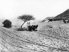 Spasmodic bursts of long-range shells fired from a German naval pattern 6-inch (15 cm) gun, occurred throughout the British Empire occupation of the Jordan Valley. Some 30 shells were fired at various camps and horse lines in the neighbourhood during the first week. During June they steadily increased artillery fire on the occupied positions, freely shelled the horse lines of the reserve regiment along the Auja, and at times inflicting severe casualties.[25][52][53]