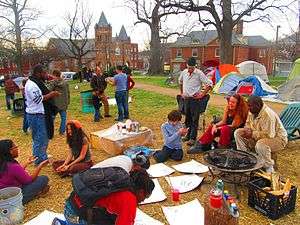 Occupy Charlottesville was a social movement in Charlottesville, Virginia, USA, that began on October 15, 2011,[1] in solidarity with Occupy Wall Street and the rest of the Occupy movement. The downtown Lee Park encampment was taken down on November 30, 2011, when 18 members of the movement were arrested and charged with trespassing.[2] The group failed to establish a campsite after the eviction, although they continued to hold their 'General Assemblies' and participate in targeted actions for several months thereafter.[3] The group's protests target social and economic injustice both locally and nationally.