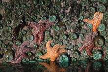 Tidepools, which occur frequently along Oregon's rocky shores, are unique, contained ecosystems housing up to many hundreds of species of animal. Red, green, and brown algae are common sights. Many species of invertebrates can also be found in these coastal tidepools, and include sponges, sea anemones, mussels, sea stars, limpets, crabs, shrimp, barnacles, sea urchins, and sea cucumbers.[18] Sunset Bay State Park, near Coos Bay, and Strawberry Hill, near Yachats, are among the largest collections of tidepools and are popular places for exploring them.