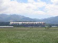 Further south outside Tillamook sits the Tillamook Air Museum, which is housed in one of the two former military blimp hangars of the former Naval Air Station Tillamook. The structure was originally known as "Hangar B" and was part of a pair of hangars built by the U.S. Navy in 1942.[48] "Hangar A" was destroyed by a fire in 1992. However, the concrete pilings that held the massive hangar doors erect still stand.