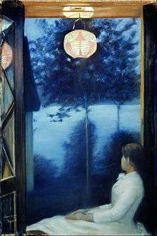 Having little formal art education, she quickly absorbed the knowledge of the artistic environment she was a part of. Her debut was in 1886 with Ved Kristianiafjorden (Japansk lykt) («By the Oslofjord (Japanese lantern)»), which now is stored in the National Gallery of Norway. Her first years as an artist are seen as an example of new Romantic painting. Her later portrait works make another, more robust impression. Oda Krohg is known for her landscapes, among them Ved Kristianiafjorden (Japansk lykt) and Ved engen (Kinesisk lykt) («On the meadow (Chinese lantern)», 1889) and other works like En abonnent på Aftenposten («A subscriber to the Evening Post», 1887), Fra festen («From the party», 1892) and Rouge et Noir (1912) and the brave Christian Krohg på Karl Johan («Christian Krohg at Karl Johansgate», 1912). She also painted portraits of, among others, Aasta Hansteen, Ivar Arosenius, Gunnar Heiberg, Johanne Dybwad and Christian Krohg.