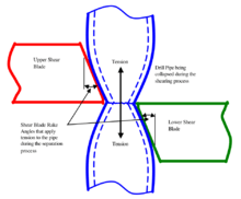 Blowout Preventers often contain a stack of independently-operated cutoff mechanisms, so there is redundancy in case of failure, and the ability to work in all normal circumstances with the drill pipe in or out of the well bore. The BOP used in the Deepwater Horizon, for example, had five "rams" and two "annular" blowout preventers.[13] The rams were of two types: "pipe rams" and "shear rams". If the drill pipe is in the well, the pipe rams slide perpendicular to the pipe, closing around it to form a tight seal. The annular preventers also close around the pipe, but have more of a vertical motion, so they loosen slightly if the drill pipe is being pushed downward, as might be necessary in a "snubbing" or "well kill" operation.[14] Shear rams may be used as a last resort[15] to cut through the drill pipe and shut off everything, including whatever might be coming up inside the drill pipe.
