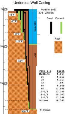 Casing of offshore oil wells is done with a set of nested steel pipes, cemented to the rock walls of the borehole as in Figure 4. Each section is suspended by a threaded adapter inside the bottom end of the section above.[18] Failure of either the casings or the cement can lead to injection of oil into groundwater layers, flow to the surface far from the well, or a blowout at the wellhead.[19] [20] [21]