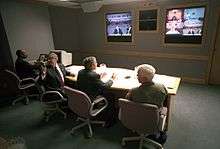 Air Force One landed at Offutt shortly before 3:00 pm[12] At 3:06, Bush passed through security to the US Strategic Command Underground Command Center (41°06′50″N 095°55′04″W / 41.11389°N 95.91778°W / 41.11389; -95.91778)[12] and was taken into an underground bunker designed to withstand a nuclear blast.[15] There, he held a teleconference call with Vice-President Cheney, National Security Advisor Condoleezza Rice, Defense Secretary Donald Rumsfeld, Deputy Secretary of State Richard Armitage, CIA Director Tenet, Transportation Secretary Norman Mineta, and others.[15] The meeting lasted about an hour. Rice recalled that during the meeting, Tenet told Bush, "Sir, I believe it’s al-Qaeda. We’re doing the assessment but it looks like, it feels like, it smells like al-Qaeda."[16] The White House staff was preparing for Bush to address the nation from the Offutt bunker, but Bush decided instead to return to Washington.[15]