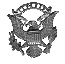 OSU ROTC's shoulder insignia was a red and gray circle. This was worn on the right shoulder. On the right sleeve, a five pointed star signifying OSU was the recipient of the ROTC Honor School award was worn. Near the cuff of the left sleeve, a shield patch with U.S. R.O.T.C embroidered on it was worn. If the cadet had attained a rank in ROTC, they wore their rank insignia on each sleeve. The color of rank chevrons and the ROTC shield patch were determined by the military division in which the cadet was looking to commission. For example, an Artillery cadet would wear a black shield with scarlet lettering and black chevrons on a scarlet background, while an Infantry cadet would wear a black shield with teal lettering and black chevrons on a teal background. The hat took on a more modern look as well, looking more like the modern military style visor hat. ROTC chin straps and uniform buttons were gold colored. The peace eagle remained, but an addition was made to the eagles, an extra banner that arced above the E. Pluribus Unum banner from the eagle’s beak. This banner simply read “OHIO,” earning the OSUMB’s peace eagles the nickname “Eagle Ohio.” These early Eagle Ohios were made in gold colored metal to match the buttons and chin strap of the uniform jacket and hat. The regular uniform of an OSU ROTC cadet included a navy blue service coat, a light blue dress shirt, black tie, navy blue pants, white cotton spats, black dress shoes, and a white canvas belt with a gold buckle.