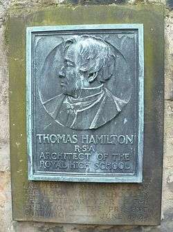 Thomas Hamilton RSA (1784–1858), was architect of the Royal High School building on Regent Road, the Bank of Scotland on the Mound, Physicians Hall on Queen Street, the Dean Gallery, and many other notable buildings, mainly in Edinburgh and Ayrshire. He co-founded the Royal Scottish Academy (RSA) in 1826. His monument is relatively recent and he was previously undeclared within his family vault. There is now a bronze plaque bearing his likeness on the rear wall of the vault, having been erected by the pupils of the Royal High School on the centenary of the building of the school, June 1929. The stone in front of this vault has interesting Masonic iconography.