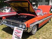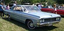 The 1964 model appeared very similar to the 1963. Curb weight was down, but overall length was up to 215.3 inches (5,468.6 mm). Sales dropped further, to 13,753 coupes (down 36%) and 2,410 convertibles (down 45%).[7] The Starfire now shared its basic bodyshell with the new and lower-priced Jetstar I hardtop coupe which competed directly against the Pontiac Grand Prix. The Jetstar also used the Starfire's 345 hp (257 kW) 394 cu in (6.5 l) "Ultra High Compression" Rocket V8, but had a pricetag that was over $500[8] lower than the Starfire due to the use of a vinyl bucket seat interior and the fact that many Starfire standard features were optional on the Jetstar including Hydra-Matic transmission, power steering and brakes. Front seat belts were now standard.[9]