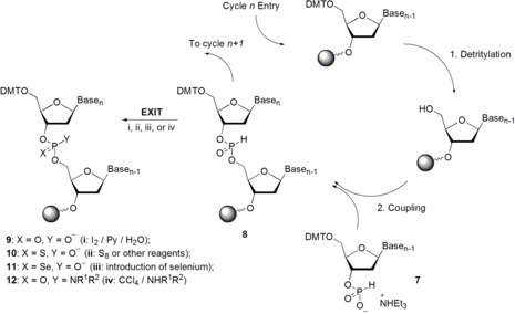Oligonucleotide synthesis is carried out by a stepwise addition of nucleotide residues to the 5'-terminus of the growing chain until the desired sequence is assembled. Each addition is referred to as a synthetic cycle (Scheme 5) and consists of four chemical reactions: