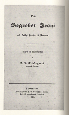 On the Concept of Irony with Continual Reference to Socrates (Danish: Om Begrebet Ironi med stadigt Hensyn til Socrates) is Søren Kierkegaard's 1841 doctoral thesis under Frederik Christian Sibbern.[1] This thesis is the culmination of three years of extensive study on Socrates, as seen from the view point of Xenophon, Aristophanes, and Plato.[2]