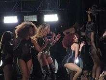 Alexander Wang designed a "bondage body suit" worn by Beyoncé during the show, as well as multiple pieces by Nicola Formichetti for Diesel. One of these included the previously mentioned denim outfit, which was "made from the company's patented Jogg Jean material, accented with hand-applied hardware and studwork, Swarovski crystal elements and black leather accessories", worn for the performance of "Run the World (Girls)". Formichetti commented on the outfit, saying "Every classic cops and robbers story blurs the lines between the good and bad, we wanted Beyoncé's to be both. Her look is one part police officer and two parts jailbait."[26] Another piece designed by Diesel was an outfit consisting of jean-shorts and a leather jacket embroiled with the word "Texas". Biker gangs that developed in the United States after World War II served as an inspiration for the outfit; Beyoncé's was meant as a tribute to her hometown and a reminder of her roots. It took 4–5 hours to add the word Texas to the leather jacket.[27] The bondage bodysuit was described as "a riff off of an urban bomber hoodie jacket that was cropped to expose a bondage bodysuit underneath that has graphic cutouts. When worn up, the oversized hood covers the face, adding an incognito element reminiscent of the On The Run theme." It also contained snakeskin seamed into the sleeves of the outfit.[28] One of the more controversial pieces worn by Beyoncé during the On the Run Tour was a black, thong leotard that "put her bare rear end on display in a kind of cage-like cutout". Erica Schwiegershausen of The Cut blog wrote that the number was a "somewhat disorienting look".[29] During the performance of "Single Ladies (Put a Ring on It)", Beyoncé revisited a leotard from the song's music video in a black and gold lace bodysuit designed by Michael Costello who wanted "Beyoncé to feel beautiful, strong, super sexy and ventilated" with the outfit.[30] Lebanese designer Elie Saab created a bridal-themed, white long-sleeve lace-embellished jumpsuit for Beyoncé for the performances of "Resentment" and "Love On Top" which was part of his Pre-Fall 2014 collection.[31]