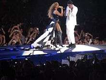 Both Beyoncé and Jay-Z sported multiple outfits throughout the different performances of the tour. One of the more prominent designers for the tour was Versace, in which Beyoncé wore both a fishnet and leather Atelier black bodysuit (complete with a plunging neckline, a fishnet head mask and high heel combat boots), as well as a colourful Atelier bodysuit from the designer. The leather Atelier black bodysuit took approximately 200 hours to craft and was used for the opening number of the tour, "'03 Bonnie & Clyde".[19] The colourful bodysuit was commented on by Versace who stated that the team had their inspiration from the street for the colour and added various crystals and stripes to show a "baseball vibe" while also trying to capture Beyoncé's energy.[20] Beyoncé's tour shoes were designed by Stuart Weitzman and Joker's Closet.[21] Other outfits included a denim jumpsuit and a bedazzled leotard bodysuit that "showed off her derrière".[22] Beyoncé also sported more thematic and dramatic pieces of clothing, including a full bridal veil and a sweeping train made of a black-and-white American flag.[17] The American flag outfit was designed by Riccardo Tisci of Givenchy and took over 500 hours to create. The American flag train was 16.4 feet long but weighed around 500 grams allowing it to fly in the wind. The individual stars on the outfit were hand-embroidered and its inspiration was said to be "American Danger: Bonnie & Clyde with a modern twist."[23] For the performance of "Ring the Alarm", Beyoncé returned to designer Vrettos Vrettakos (with whom she collaborated with notably on her previous solo tour).[24] Designed by Dennis Kolpodinos, Vrettakos produced a red, "couture 'crystal spirit' bodysuit" complete with fringe details on the limbs and "embellished with Swarovski crystals for stage-ready shine".[25]