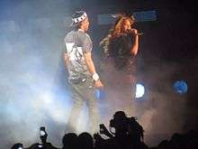 In July 2013, Jay-Z stated that a joint tour with Beyoncé was "slowly making sense, more sense every day".[5] Throughout 2013 and 2014, during Beyoncé's The Mrs. Carter Show World Tour, Jay-Z made multiple guest appearances, starting in July at The Sound of Change Live charity concert where the couple performed "Crazy in Love" together,[6] shortly followed by another guest appearance at Brooklyn's Barclays Center in August, where Jay-Z performed "Tom Ford" accompanied by Beyoncé's backing vocals as found in the song.[7] During Beyoncé's final leg of the tour in 2014, Jay-Z appeared a total of seven times to perform their most recent collaboration, "Drunk in Love", together. Jay-Z accompanied Beyoncé on all six nights of her O2 Arena stint in London and finally, at the last night of the tour in Lisbon.[8][9]