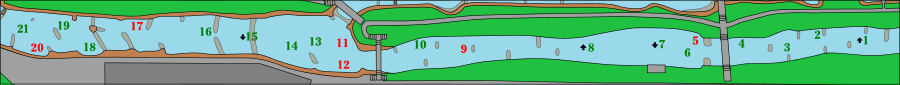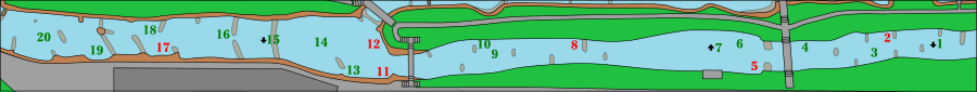 The gate maps for these races are shown below, upstream gates in red. All gates are 2-pole gates; numbers with arrows are flush gates navigated in the direction of the arrow.