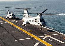 USS Guam and USS Trenton began transit from the coast of Oman towards Mogadishu at 22:30 (23:30 Oman time)[lower-alpha 1] on 2 January.[2]:13 The commander of Amphibious Group Two had initially proposed a seven-ship Amphibious Task Group, composed of vessels anchored at Masirah Island (off Oman) and Dubai and including four amphibious ships so that the full range of amphibious capabilities would be available for the operation.[2]:12 However, intervention in Kuwait seemed imminent[lower-alpha 4] and the commander of naval forces at Central Command did not want to divert that many ships from the Persian Gulf, thus the decision to send two of the closest ships.[2]:12-13 Although the two vessels were selected by mid-afternoon on 2 January, the transfer of some personnel from Dubai to Masirah caused a delay of eight to ten hours.[2]:14 Guam and Trenton carried forces from the 4th Marine Expeditionary Brigade, including a detachment of CH-53E Super Stallion helicopters—the largest helicopters operated by the US military—and two squadrons of CH-46 Sea Knight helicopters.[6][2]:2