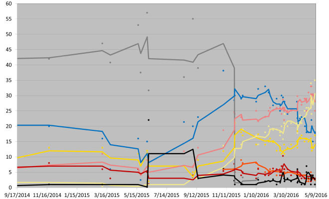 | Date | Apr 23–29, 2016 | Apr 25–29, 2016 | Apr 26–29, 2016 | Apr 28–30, 2016 | Apr 27-May 1, 2016 | May 1-3, 2016 | May 1-5, 2016 | ||