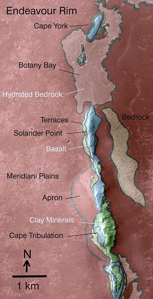 Here at the rim of the Endeavour crater the rover moved around a geographic feature named Cape York. The Mars Reconnaissance Orbiter had detected phyllosilicates there, and the rover analyzed the rocks with its instruments to check this sighting on the ground. This structure was analyzed in depth until summer 2013. At May 2013 the rover was heading south to a hill named Solander Point.