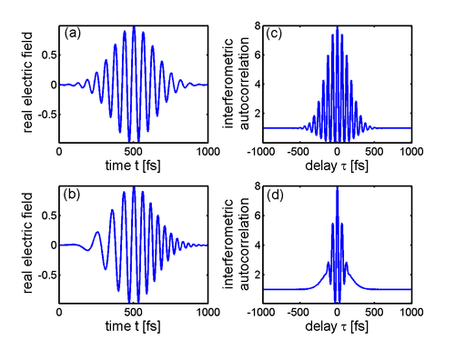 is called the interferometric autocorrelation. It contains some information about the phase of the pulse: the fringes in the autocorrelation trace wash out as the spectral phase becomes more complex.