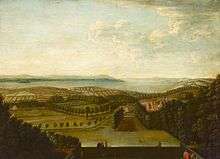 Painting of Orchard Wyndham, 18th century English School, National Trust, collection of Petworth House. Northward beyond the house is the town of Watchet and its harbour (with pier built by Sir William Wyndham, 3rd Baronet (1687–1740)), historically part of the estate, on the Bristol Channel