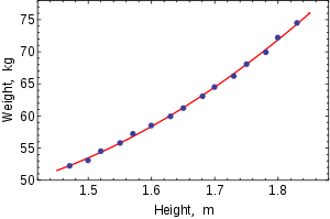 This example also demonstrates that coefficients determined by these calculations are sensitive to how the data is prepared. The heights were originally given rounded to the nearest inch and have been converted and rounded to the nearest centimetre. Since the conversion factor is one inch to 2.54 cm this is not an exact conversion. The original inches can be recovered by Round(x/0.0254) and then re-converted to metric without rounding. If this is done the results become: