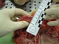 Eccentric hypertrophy is a type of hypertrophy where the walls and chamber of a hollow organ undergo growth in which the overall size and volume are enlarged. It is applied especially to the left ventricle of heart.[2] Sarcomeres are added in series, as for example in dilated cardiomyopathy (in contrast to hypertrophic cardiomyopathy, a type of concentric hypertrophy, where sarcomeres are added in parallel).