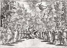 Another popular court entertainment at this time was the "madrigal comedy", later also called "madrigal opera" by musicologists familiar with the later genre. This consisted of a series of madrigals strung together to suggest a dramatic narrative, but not staged.[3] There were also two staged musical "pastoral"s, Il Satiro and La Disperazione di Fileno, both produced in 1590 and written by Emilio de' Cavalieri. Although these lost works seem only to have included arias, with no recitative, they were apparently what Peri was referring to, in his preface to the published edition of his Euridice, when he wrote: "Signor Emilio del Cavalieri, before any other of whom I know, enabled us to hear our kind of music upon the stage".[4] Other pastoral plays had long included some musical numbers; one of the earliest, La fabula d'Orfeo (1480) by Poliziano had at least three solo songs and one chorus.[5]