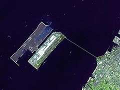 Satellite photo of Kansai Airport (lower-right island) in Osaka Bay. Kobe Airport is being built on the unfinished island near the middle of the photo. Central Osaka is in the upper-right corner, along with Osaka International.