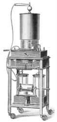 - D'Arsonval apparatus - In 1890 French physician Jacques Arsene d'Arsonval founded the field of high frequency electrotherapy, performing the first experiments applying high frequency currents to the human body. He discovered that currents above 10 kHz do not cause muscle contraction or activate nerves to cause the sensation of electric shock. D'Arsonval first used a high frequency alternator, but this device could not produce frequencies over 10 kHz. To reach higher frequencies he developed a circuit consisting of a single tuned circuit, made of two Leyden jar capacitors and a small coil of relatively few, 10 to 30 turns of heavy wire, with an induction coil and spark gap to excite oscillations. It resembled a Tesla circuit without the secondary winding. The circuit produced relatively low voltage (perhaps 30 kV), high current electricity, called "D'Arsonval currents". The circuit was "bipolar" with two wires from opposite ends of the coil connected to electrodes at different places on the patient's body. The high frequency currents could produce heat in the patient's body, similar to the operation of a microwave oven; this was called Diathermy (Behary). Other names were also used such as Thermo-Faradism and Thermo-Penetration depending on whether it was used for therapy or for destructive effects in surgery (Behary)