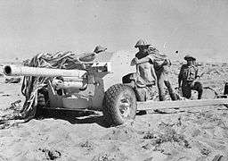 The guns in small dips had cover and were on soft sand, which could be excavated; the five guns of B Company were dug in to the south-east, facing from 90°–225°. C Company had four guns which were to the south-west, covering the angles from 225°–315° and A Company had four guns facing north-west and north. Six guns of the 239th Battery, 76th Anti-Tank Regiment RA, faced north and north east.[13] The C Company carrier platoon patrolled to the west and found about 160 Axis soldiers ready to surrender but before infantry arrived to collect them, the platoon ran into a laager of about 35 Italian tanks (XII Armoured Battalion from the 133rd Armoured Division Littorio) and German tanks, Panzerjäger (tank destroyers) and infantry (Kampfgruppe Stiffelmayer). The British opened fire and set three lorries on fire but lost a carrier while withdrawing. Most of the prisoners ran away but 35 remained from Pioneer Battalion 220 of the 164th Light Afrika Division Pioneer Battalion 33 of the 15th Panzer Division.[14]