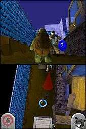 Over the Hedge is presented in full 3D on both of the Nintendo DS' screens, which is not often seen in a Nintendo DS game.[8] The upper screen displays the game in an over-the-shoulder third person perspective, whereas the touch screen shows an overhead perspective. The lower screen indicates the sight range of enemies and can be used as a touch screen to target enemies to attack.[10] The console's microphone is used to attract the attention of dogs or to rouse the woodland creatures should they be knocked unconscious.[12]