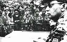 They claimed to have arrested several generals belonging to a conspiracy, the "Council of Generals", that had plotted a military coup against the government of President Sukarno. They further alleged that this coup was to take place on "Army Day" (5 October) with the backing of the CIA, and that the Council would then install themselves as a military junta.[8][9] Furthermore, the soldiers proclaimed the establishment of a "Revolutionary Council" consisting of various well-known military officers and civilian leaders that would be the highest authority in Indonesia. Additionally, they declared President Sukarno's Dwikora Cabinet as invalid ("demisioner").[10]