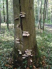 The oyster mushroom is widespread in many temperate and subtropical forests throughout the world, although it is absent from the Pacific Northwest of North America, being replaced by P. pulmonarius and P. populinus.[6] It is a saprotroph that acts as a primary decomposer of wood, especially deciduous trees, and beech trees in particular.[7] It is a white-rot wood-decay fungus.