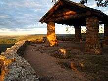 During the New Deal, the Civilian Conservation Corps employed hundreds in the construction of nearly 400 fire lookouts throughout the Ozarks at 121 known sites in Arkansas[53] and 257 in Missouri.[54] Of those lookouts, about half remain, and many of them are in use by the Forest Service. A 2007 report by the National Trust for Historic Preservation deemed these fire lookouts and related structures as one of America's 11 Most Endangered Historic Places.[55]