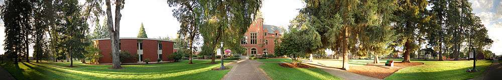 The academy was officially chartered by the territorial legislature on September 29, 1849.[7][9] The reverend Clark served as the first president of the board of trustees and later donated an additional 150 acres (60.7 ha) to the institution.[9] In 1851, what is now Old College Hall was built and in 1853 Sidney H. Marsh became the school's first president.[7] The current campus was deeded in 1851.[10] In 1854, the institution became Pacific University.[8] The first commencement occurred in 1863 with Harvey W. Scott as the only graduate.[7]