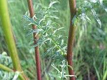 It is a biennial or perennial herb producing one erect stem from a fibrous root and caudex unit. It grows to a maximum height near one meter or slightly taller. It is mostly hairless, but sometimes has tufts of hairs in the leaf axils. The leaves may be up to 30 centimeters long near the base of the plant, their blades so deeply divided into lobes they appear to have leaflets. Each lobe is edged with teeth. Leaves occurring higher on the stem are smaller with narrower lobes.