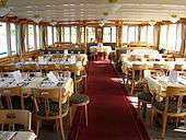 Beginning World War II, the boiler remained filled with water, and in Winter the plant room was heated to keep the temperature above the freezing point (operationally for military purposes, 24 hours a day). Between the years 1941 and 1953 larger revisions were done: Boiler repairs, extension of the upper deck, and replacement of the sun awning by a solid roof. The coal firing was replaced by a heavy oil firing unit in 1951, allowing machine staff to be reduced (in her early years, Stadt Zürich had a crew of 8). The following general overhaul and rebuilt was done in spring 1956. Unfortunately, the Art Nouveau equipment of the salon also was dismantled and replaced by a simple wood veneer. During restorations of 1989/90 and 2003/04, the ship's interior was returned into its original appearance using historically sourced material, so that a similar room experience is given today. In 1960 and 1967 main revisions in the dock had been done.[2]