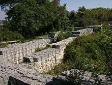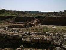 The main feature of the archaeological site is the early-9th-century Bulgarian fortified rampart with Omurtag's palace within its limits. While much smaller than the fortifications of nearby Pliska, the fort at Han Krum resembles closely the defensive walls of the capital.[6] The fortress, known to the locals as Hisar Kale (from Turkish, both words meaning "castle, fortress"), measures 405 m × 515 m (1,329 ft × 1,690 ft) and has an area of 0.2084 square kilometres (0.0805 sq mi). Several structures of the same age lay inside the fort; these included an inner fortification 92.5 m × 113.6 m (303 ft × 373 ft) in size and stone buildings of varying complexity, such as a three-roomed bath. The inner fort had its main entrance located in the eastern part.[1] The buildings within the enclosure are thought to have served as a noble dwelling, i.e. a palace, though it is archaeologically uncertain whether they date to Omurtag's reign or to a later period.[2] Balabanov theorizes that the fort accommodated a garrison commander and barracks.[1]