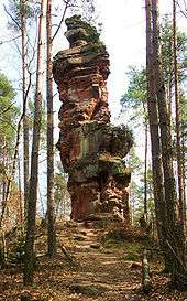 Characteristic of the highly diverse landscape of the southern Palatinate Forest are over 200 rock formations of all shapes and sizes[39] (see also Geology and Geomorphology), which not only give visitors a good insight into the geology of the region, but also the surprising adaptability of sandstone rock vegetation, especially the heathers, the undemanding grasses and the deformed Scots pine trees. Another feature of this biotope are peregrine falcons, which nest in the rocks and are under strict conservation measures (including access restrictions for climbers and walkers).