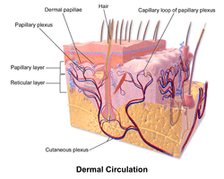 The dermis or corium is a layer of skin between the epidermis (with which it makes up the cutis) and subcutaneous tissues, that primarily consists of dense irregular connective tissue and cushions the body from stress and strain. It is divided into two layers, the superficial area adjacent to the epidermis called the papillary region and a deep thicker area known as the reticular dermis.[1] The dermis is tightly connected to the epidermis through a basement membrane. Structural components of the dermis are collagen, elastic fibers, and extrafibrillar matrix.[2] It also contains mechanoreceptors that provide the sense of touch and thermoreceptors that provide the sense of heat. In addition, hair follicles, sweat glands, sebaceous glands, apocrine glands, lymphatic vessels and blood vessels are present in the dermis. Those blood vessels provide nourishment and waste removal for both dermal and epidermal cells.
