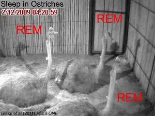 - ↑ Lesku, J. A.; Meyer, L. C. R.; Fuller, A.; Maloney, S. K.; Dell'Omo, G.; Vyssotski, A. L.; Rattenborg, N. C. (2011). Balaban, Evan, ed. "Ostriches Sleep like Platypuses". PLoS ONE. 6 (8): e23203. doi:10.1371/journal.pone.0023203. PMC 3160860