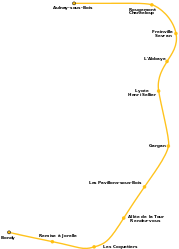 The line then runs along Pasteur Boulevard, where it makes a stop at Les Pavillons-sous-Bois Station before making its way north. After it reaches Gargan Station, which is located between Louis-Pasteur and Roy Boulevards, it travels up the former RN3 overpass, now known as Aristide-Briand Avenue, before returning to ground level again. The train then runs between Édouard-Vaillant and Maurice-Berteaux Boulevards. A bit further, the line stops at the Lycée Henri Sellier Station, then the old L'Abbaye Station before following an S-shaped route westward. It then stops at Freinville-Sevran Station, runs along the former RN370, which is now called Westinghouse Boulevard, before crossing the de l'Ourcq Canal. From this point on, the train heads directly westward. It makes a stop at Rougemont-Chanteloup Station then reaches the La Plaine à Hirson line near the bifurcation at Roissy and runs along it for a few hundred metres. The train completes its journey at Aulnay-sous-Bois Station on two dead-end tracks 7,900 metres from the line's starting point.