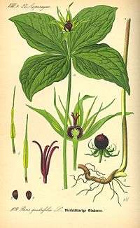 Paris quadrifolia, the herb-paris[3] or true lover's knot, is a Eurasian species of flowering plant in the family Melanthiaceae, although authorities formerly regarded it as part of the Liliaceae family. It is related to Trillium, with which it can be confused. Trillium, however, is generally 3-merous (3 leaves per whorl, 3 petals etc.), whereas Paris quadrifolia is 4-merous.[1]