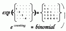 Due to its simple construction by factorials, a very basic representation of Pascal's triangle in terms of the matrix exponential can be given: Pascal's triangle is the exponential of the matrix which has the sequence 1, 2, 3, 4, … on its subdiagonal and zero everywhere else.