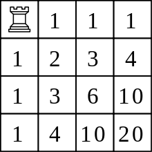 Pascal's triangle overlaid on a grid gives the number of distinct paths to each square, assuming only rightward and downward movements are considered.