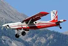 A Pilatus PC-6 V-622 "Felix", painted in Patrouille Suisse colours, transports the commander, announcer and the team groundcrew.[15][16]