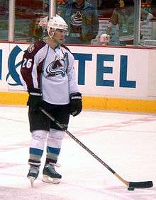 Before training camp, it was not expected he would start the season with the Avalanche, but rather for an affiliate team of the Avalanche.[1][18] However, Steve Konowalchuk's career-ending heart problem opened a roster spot and Stastny's play impressed Avalanche coach Joel Quenneville.[18][31] Stastny started the season with the jersey number 62 until his teammate John-Michael Liles (switching to #4) changed his to let Stastny use #26, the same his father wore when he played for the franchise while it was in Quebec.[32] Stastny had his first NHL assist on a goal by Wojtek Wolski in his third NHL game, on October 8 against the Vancouver Canucks.[33][34] On October 21, in his eighth NHL game and first wearing number 26, Stastny scored his first NHL goal in Montreal against David Aebischer of the Montreal Canadiens.[35]