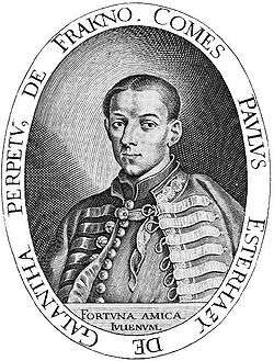 Paul I, Prince Esterházy of Galántha[1][2][3] (full German name: Paul Fürst Esterházy von Galantha; full Hungarian name: galánthai herceg Esterházy Pál) (8 September 1635[1][3][4] – 26 March 1713) was the first Prince Esterházy of Galántha from 1687 to 1713, Palatine of the Kingdom of Hungary from 1681 to 1713, and an Imperial Field Marshal.[1][4] Paul was also an accomplished poet, harpsichordist, and composer.[4][5] He actively participated in various battles against the Ottoman Turks during the Fourth Austro-Turkish War (1663–1664) and the Great Turkish War (1662–1669). Paul is credited with establishing the wealth, power, and influence of the Princely House of Esterházy.[3][4]
