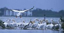 The American white pelican (Pelecanus erythrorhynchos) is a large aquatic soaring bird from the order Pelecaniformes. It breeds in interior North America, moving south and to the coasts, as far as Central America and South America, in winter.[2]